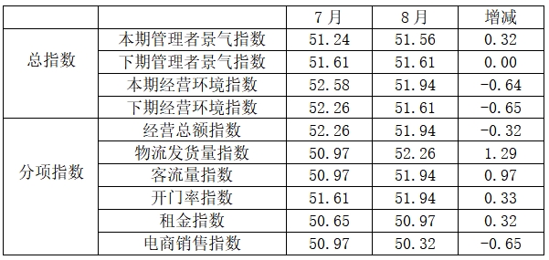 分項指數(shù)中,經(jīng)營總額指數(shù)為51.94,比7月的52.26下降0.32個百分點;物流發(fā)貨量指數(shù)為52.26,比7月的50.97上升1.29個百分點;客流量指數(shù)為51.94,比7月50.97上升0.97個百分點;開門率指數(shù)為51.94,比7月的51.61上升0.33個百分點;租金指數(shù)為50.97,比7月的50.65上升0.32個百分點;電商銷售指數(shù)為50.32,比7月的50.97下降0.65個百分點。