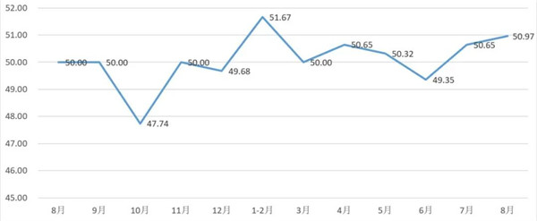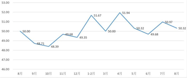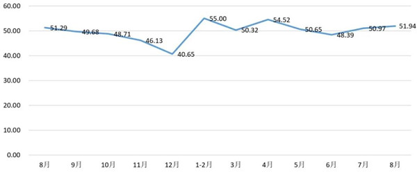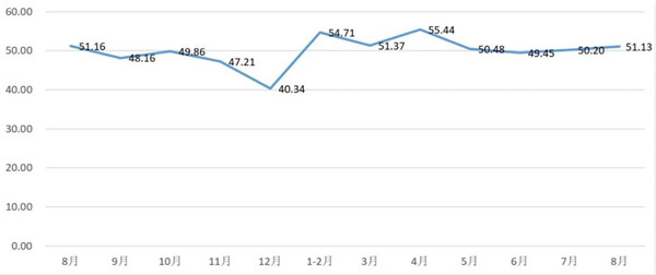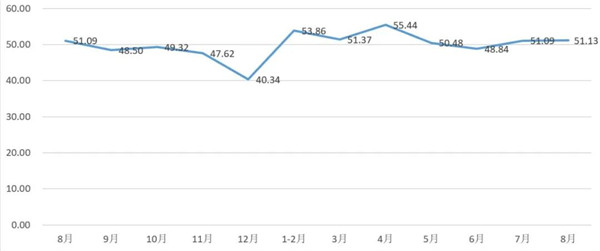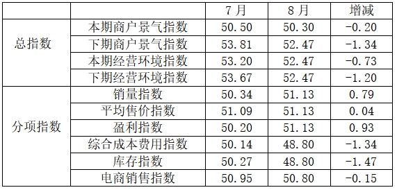 分項指數(shù)中,銷量指數(shù)為51.13,比7月的50.34上升0.79個百分點;平均售價指數(shù)為51.13,比7月的51.09上升0.04個百分點;盈利指數(shù)為51.13,比7月的50.20上升0.93個百分點;綜合成本費用指數(shù)為48.80,比7月的50.14下降1.34個百分點;庫存指數(shù)為48.80,比7月的50.27下降1.47個百分點;電商銷售指數(shù)為50.80,比7月的50.95下降0.15個百分點。