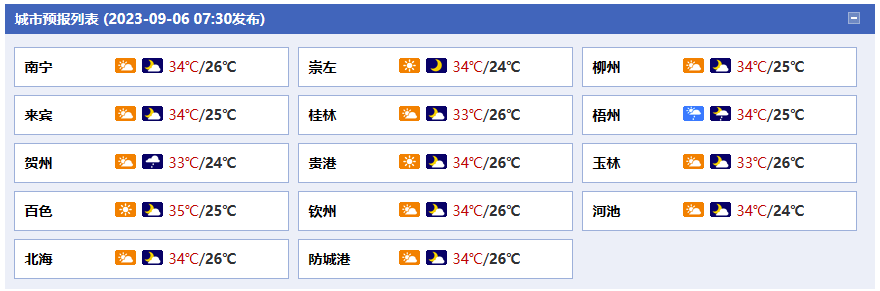 南寧市:今天白天到今天晚上,多云間晴,東北風1~2級,最高氣溫34℃,最低氣溫26℃。