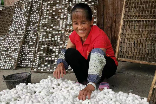 9月7日,廣西河池市宜州區(qū)安馬鄉(xiāng)安馬社區(qū)木塘屯的養(yǎng)蠶戶盧獻峰開心地向筆者表示:“我今年種桑8畝,上半年養(yǎng)了5批,每批有130-135公斤繭,蠶繭價格平均55元/公斤,下半年我已賣一批繭,共155公斤,繭價60元/公斤,單批養(yǎng)蠶收入9300元。今年蠶繭價格高,折算下來一個蠶繭1毛錢了,只要能養(yǎng)好,剛結(jié)繭就有人上門收購,現(xiàn)金交易,一月兩批蠶,月入小兩萬。下半年我要多養(yǎng)1-2批蠶,預計要養(yǎng)6-7批,現(xiàn)在第二批大蠶也準備開始上蔟結(jié)繭,我要馬上去摘葉喂蠶了?!?o:p>