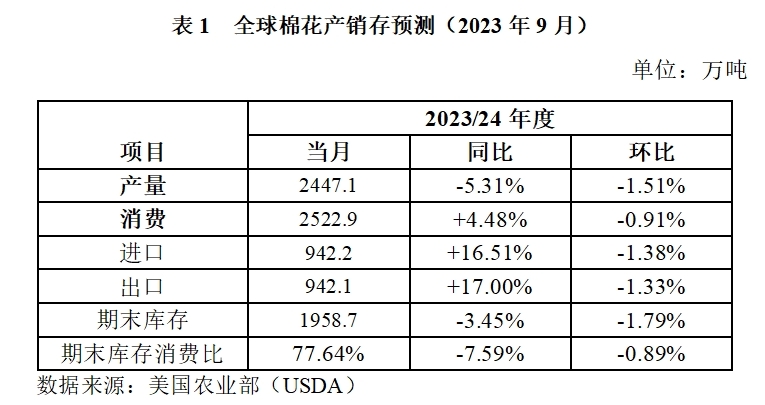 據(jù)美國(guó)農(nóng)業(yè)部9月份數(shù)據(jù)預(yù)測(cè),2023年度全球棉花產(chǎn)量2447萬(wàn)噸,較上月調(diào)減38萬(wàn)噸,減幅1.51%,同比減少137萬(wàn)噸,減幅5.31%;消費(fèi)量2523萬(wàn)噸,較上月調(diào)減23萬(wàn)噸,減幅0.91%,同比增加108萬(wàn)噸,增幅4.48%;產(chǎn)需缺口擴(kuò)大至76萬(wàn)噸。期末庫(kù)存消費(fèi)比77.64%,較上月下降0.89個(gè)百分點(diǎn),同比下降7.59個(gè)百分點(diǎn)。