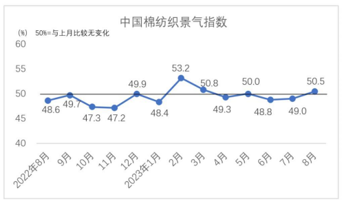 說(shuō)明:中國(guó)棉紡織行業(yè)景氣指數(shù)采集自全國(guó)近500家次棉紡織廠,參考國(guó)家制造業(yè)PMI等指數(shù)制定方式,通過(guò)對(duì)多個(gè)主要指標(biāo)加權(quán)計(jì)算得出,當(dāng)指數(shù)高于50,表示棉紡織行業(yè)本月景氣程度好于上月,低于50則表示本月景氣程度不及上月。