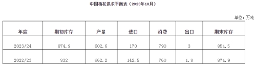 9月,全國棉花采摘、交售工作逐步展開,受新疆棉花生育期偏晚影響,采摘和交售進(jìn)度均慢于去年,月底大范圍收購還未開始,新疆以手摘棉為主,機(jī)采棉僅有少量采收,收購價(jià)格高于去年。紡織市場(chǎng)旺季不及預(yù)期,同時(shí)國內(nèi)棉花市場(chǎng)供應(yīng)充足,滑準(zhǔn)稅配額逐漸下發(fā)至紡織企業(yè),儲(chǔ)備棉銷售有序進(jìn)行,國內(nèi)棉價(jià)沖高回落,走勢(shì)弱于國際,內(nèi)外棉價(jià)差縮小。據(jù)中國棉花協(xié)會(huì)預(yù)計(jì),2023/24年度我國棉花產(chǎn)量602.6萬噸,同比下降9%,較上期下調(diào)25.3萬噸;消費(fèi)量、進(jìn)口量和出口未做調(diào)整,分別為790萬噸、170萬噸和3萬噸;期末庫存相應(yīng)調(diào)整為854.5萬噸,同比下降2.3%。
