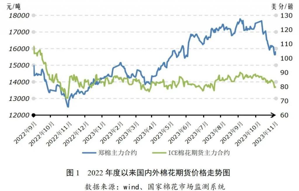 10月中旬以來,國內棉農(nóng)惜售心理松動,籽棉收購僵持局面逐漸被打破,新棉加工上市進度大幅加快,而下游紡織市場轉弱跡象明顯,棉紗貿(mào)易商低價拋售增多,棉花期現(xiàn)貨價格快速下跌。受制于需求支撐不足,儲備棉銷售停止后,棉花價格未出現(xiàn)反彈。截至2023年11月22日,鄭州商品交易所棉花期貨主力合約結算價為15380元/噸,環(huán)比下跌5.7%;代表內地標準級皮棉市場價格的國家棉花價格B指數(shù)為16601元/噸,環(huán)比下跌6.1%。