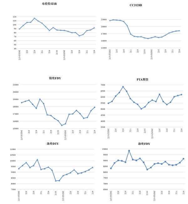 圖1 2022年1月~2023年9月我國化纖長絲、棉花、PTA期貨及布倫特原油價(jià)格走勢(shì)