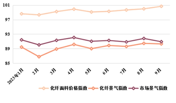 圖2 2023年1~9月我國市場景氣、化纖景氣和化纖面料價(jià)格指數(shù)走勢(shì)