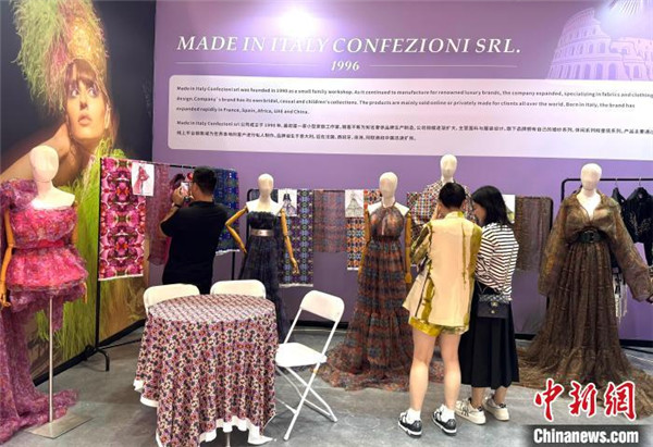 一襲拖地長(zhǎng)裙、印花無(wú)袖雪紡衫……在展會(huì)一側(cè),一件件富有設(shè)計(jì)感的服飾被穿在模特道具上,吸引了眾人圍觀和點(diǎn)贊,這是意大利設(shè)計(jì)師菲利浦的最新作品。