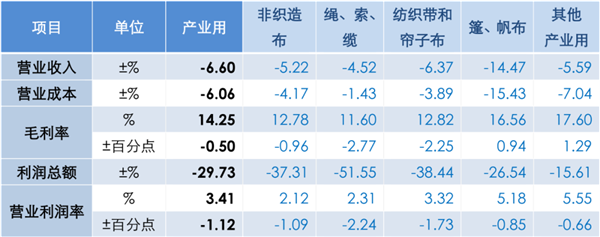 經(jīng)濟(jì)效益方面,1-9月產(chǎn)業(yè)用紡織品行業(yè)規(guī)模以上企業(yè)的營業(yè)收入和利潤總額分別同比下降6.6%和29.7%,自二季度以來持續(xù)收窄;營業(yè)利潤率為3.4%,相比二季度提高0.6個百分點(diǎn);行業(yè)虧損面為23.6%,虧損企業(yè)的虧損額同比增長23.1%。當(dāng)前,行業(yè)主要經(jīng)濟(jì)效益指標(biāo)持續(xù)修復(fù),但仍面臨原材料價格波動、需求支撐不足、市場競爭激烈等挑戰(zhàn)。