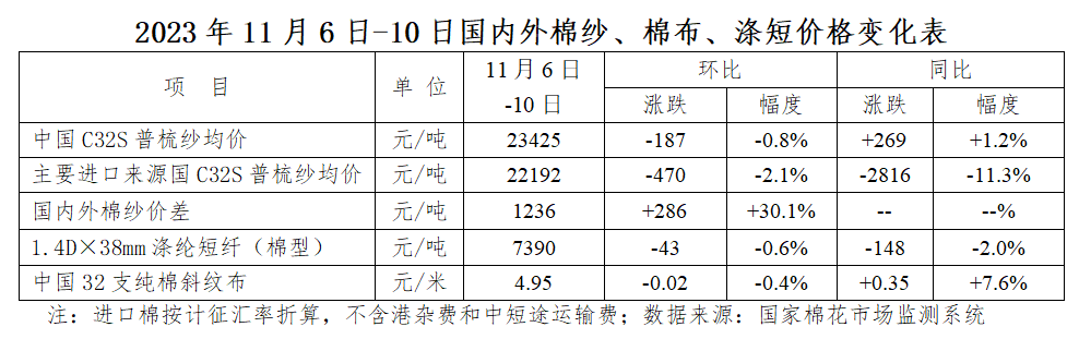 本周(2023年11月6日-10日),國內棉花價格區(qū)間波動,國際棉花價格連續(xù)大跌后小幅反彈;國內棉紗價格由跌轉穩(wěn),國際棉紗價格繼續(xù)下跌;國內滌綸短纖價格震蕩運行。