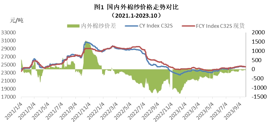 本月內(nèi)外棉紗價(jià)格均下跌,國(guó)產(chǎn)32支純棉紗10月均價(jià)為24122元/噸,較上月下跌402元,跌幅1.64%,較去年同期上漲94元,漲幅0.39%;進(jìn)口32支純棉紗10月均價(jià)24312元/噸,較上月下跌了258元,跌幅1.06%,較去年同期下降了411元,跌幅1.66%。