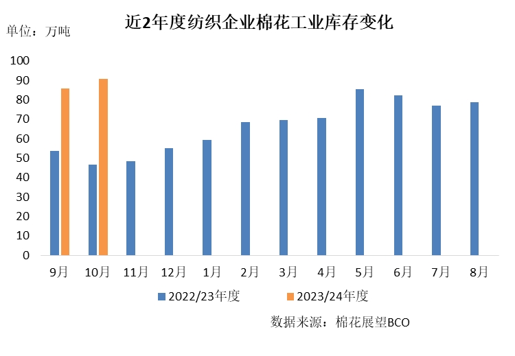 紡織企業(yè)新增訂單不佳,原料采購(gòu)偏謹(jǐn)慎,但由于儲(chǔ)備棉持續(xù)輪出,企業(yè)競(jìng)拍仍相對(duì)積極,月內(nèi)原料庫存有所增加。截至10月30日,紡織企業(yè)在庫棉花工業(yè)庫存量為90.7萬噸,環(huán)比增加4.99萬噸,同比增加44.19萬噸。其中:21%的企業(yè)減少棉花庫存,38%增加庫存,41%基本保持不變。