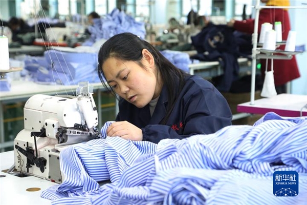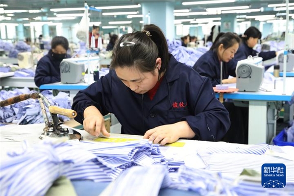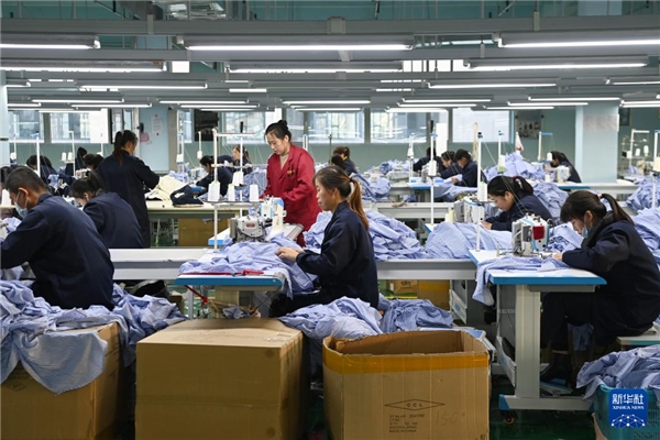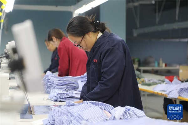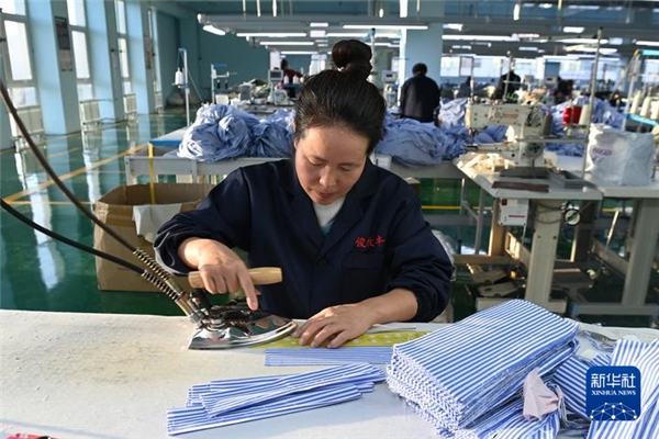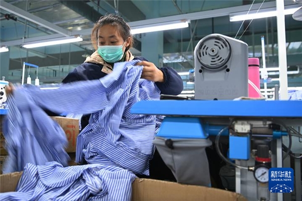 11月23日,工作人員在膠州·通渭服裝產(chǎn)業(yè)園的一家服裝企業(yè)生產(chǎn)車(chē)間工作。新華社記者 范培珅 攝