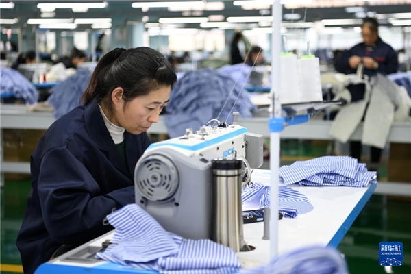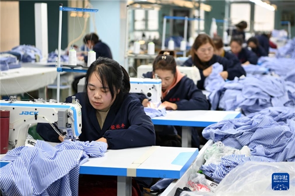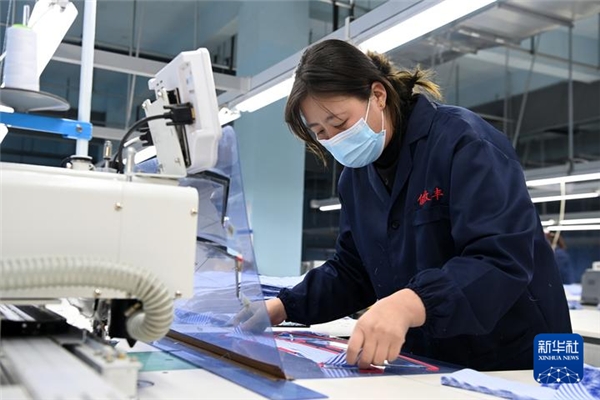 11月23日,工作人員在膠州·通渭服裝產(chǎn)業(yè)園的一家服裝企業(yè)生產(chǎn)車(chē)間工作。 新華社記者 馬莎 攝
