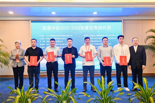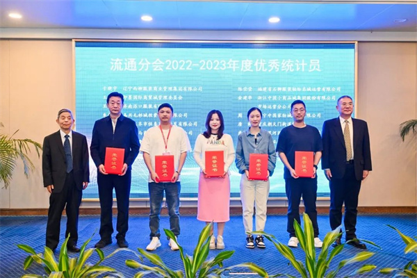 中國紡織工業(yè)聯(lián)合會流通分會顧問楊東輝(左一)、中國紡織工業(yè)聯(lián)合會流通分會會長徐建華(右一)為優(yōu)秀統(tǒng)計(jì)員頒發(fā)證書。