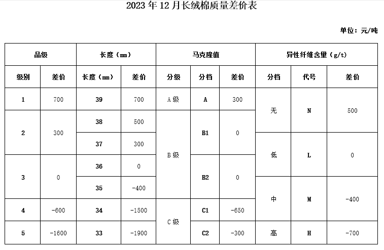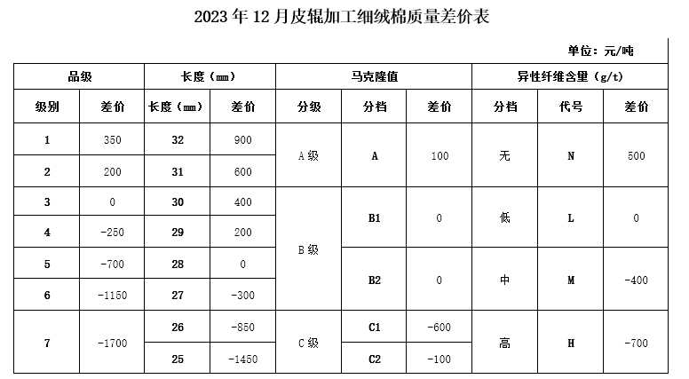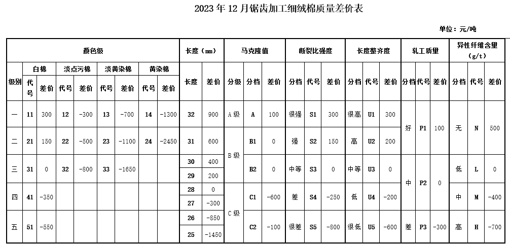 根據(jù)《中國棉花協(xié)會(huì)國產(chǎn)棉質(zhì)量差價(jià)表管理辦法》規(guī)定,現(xiàn)正式發(fā)布2023年12月《鋸齒加工細(xì)絨棉質(zhì)量差價(jià)表》、《皮輥加工細(xì)絨棉質(zhì)量差價(jià)表》和《長絨棉質(zhì)量差價(jià)表》(單位:元/噸)。