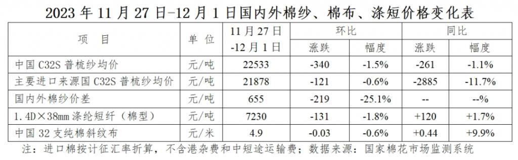 本周(2023年11月27日-12月1日),國內(nèi)棉花價格連續(xù)下跌后小幅反彈,國際棉花價格震蕩下跌;國內(nèi)棉紗價格由跌轉(zhuǎn)穩(wěn),國際棉紗價格持續(xù)下跌;滌綸短纖價格延續(xù)跌勢。