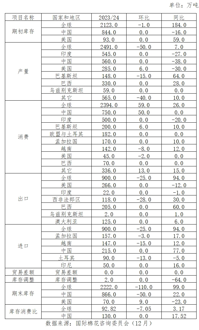國際棉花咨詢委員會(ICAC)2023年12月份發(fā)布的數(shù)據(jù)顯示,2023/24年度,全球棉花期初庫存2123萬噸,環(huán)比減少1萬噸,同比增加184萬噸;產(chǎn)量2491萬噸,環(huán)比減少50萬噸,同比增加7萬噸;消費2394萬噸,環(huán)比增加59萬噸,同比增加26萬噸;期末庫存2222萬噸,環(huán)比減少110萬噸,同比增加99萬噸;期末庫存消費比92.82%,環(huán)比下降7.05個百分點,同比上升3.17個百分點(詳見附件1)。