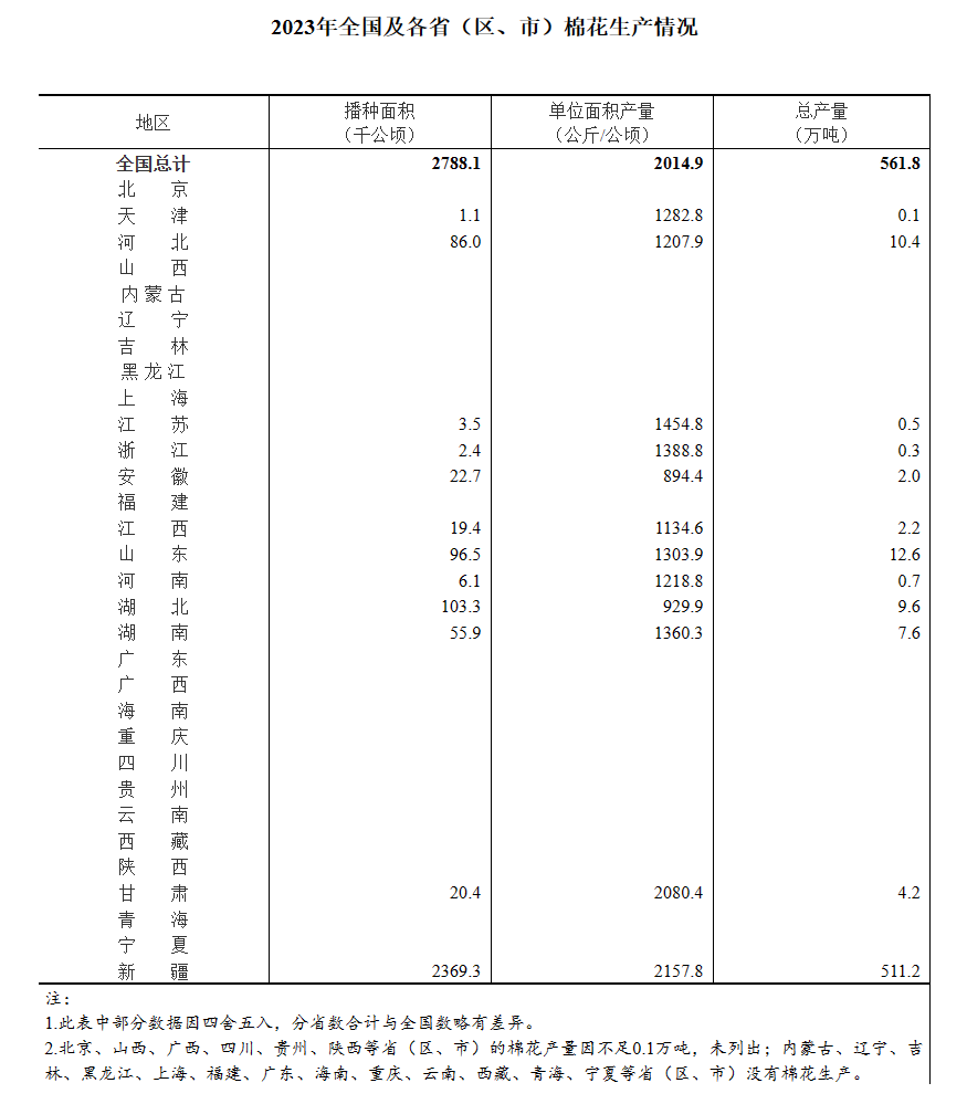 根據(jù)對全國31個?。▍^(qū)、市)的統(tǒng)計調(diào)查(新疆棉花播種面積通過遙感測量取得),2023年全國棉花播種面積、單位面積產(chǎn)量和總產(chǎn)量分別如下:
