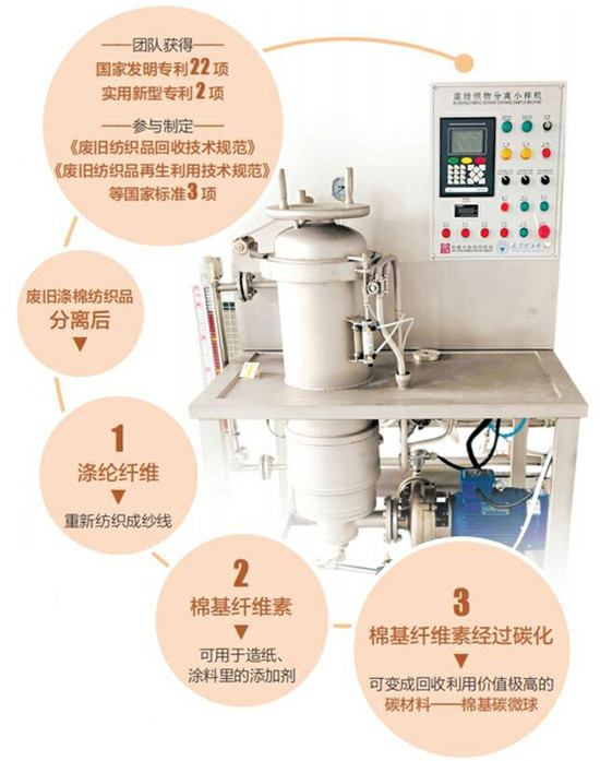 “如果無(wú)法適應(yīng)規(guī)?;姆纸馀c生產(chǎn),那么舊衣物循環(huán)利用仍是紙上談兵。”為此,團(tuán)隊(duì)定制了一次能處理4千克左右織物的反應(yīng)容器——混紡織物分離小樣機(jī),并將酸性水溶液置換成低共熔溶劑,在大大降低反應(yīng)溫度的情況下,使棉纖維產(chǎn)生溶脹作用,可以被快速切割、分離。經(jīng)過一系列實(shí)驗(yàn)探究和嘗試,團(tuán)隊(duì)終于實(shí)現(xiàn)在常壓條件下滌棉混紡織物的規(guī)模化高效分離,打通了滌棉混紡織物循環(huán)利用的關(guān)鍵堵點(diǎn),為推動(dòng)廢舊紡織品高值化回收利用提供技術(shù)支持。