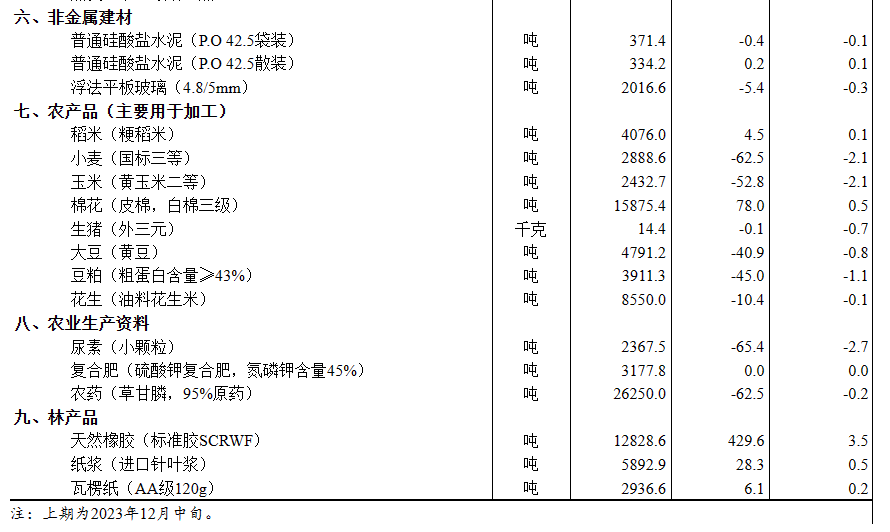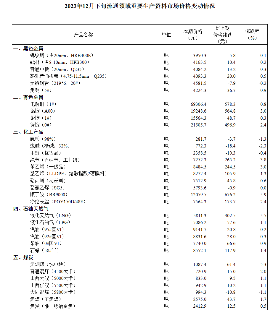 據(jù)對全國流通領(lǐng)域9大類50種重要生產(chǎn)資料市場價格的監(jiān)測顯示,2023年12月下旬與12月中旬相比,24種產(chǎn)品價格上漲,24種下降,2種持平。