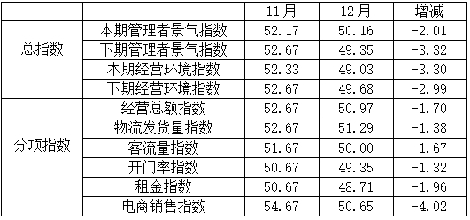 數(shù)據(jù)顯示,管理者方面,下期管理者景氣指數(shù)為49.35,比11月的52.67下降3.32個(gè)百分點(diǎn);下期經(jīng)營(yíng)環(huán)境指數(shù)為49.68,比11月的52.67下降2.99個(gè)百分點(diǎn)。商戶方面,下期商戶景氣指數(shù)為48.94,比11月的54.49下降5.55個(gè)百分點(diǎn);下期經(jīng)營(yíng)環(huán)境指數(shù)為48.31,比11月的54.20下降5.89個(gè)百分點(diǎn)??梢姽芾碚吲c商戶對(duì)1月經(jīng)營(yíng)信心不足。