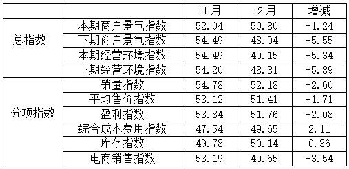 從商戶景氣指數(shù)來看,總指數(shù)中,12月商戶景氣指數(shù)為50.80,比11月的52.04下降1.24個(gè)百分點(diǎn);經(jīng)營(yíng)環(huán)境指數(shù)為49.15,比11月的54.49下降5.34個(gè)百分點(diǎn)。
