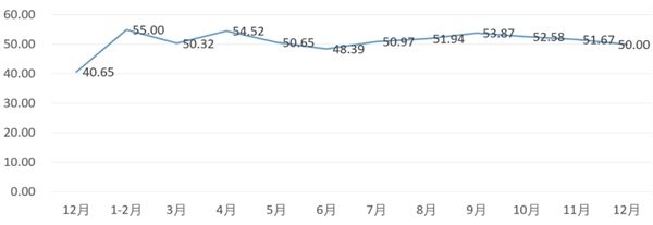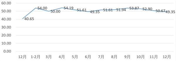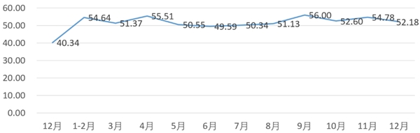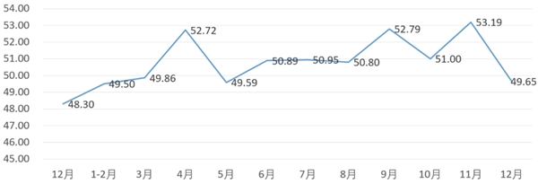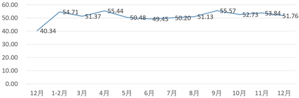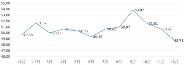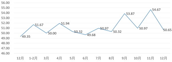 分項(xiàng)指數(shù)中,銷量指數(shù)為52.18,比11月的54.78下降2.60個(gè)百分點(diǎn);平均售價(jià)指數(shù)為51.41,比11月的53.12下降1.71個(gè)百分點(diǎn);盈利指數(shù)為51.76,比11月的53.84下降2.08個(gè)百分點(diǎn);綜合成本費(fèi)用指數(shù)為49.65,比11月的47.54上升2.11個(gè)百分點(diǎn);庫存指數(shù)為50.14,比11月的49.78上升0.36個(gè)百分點(diǎn);電商銷售指數(shù)為49.65,比11月的53.19下降3.54個(gè)百分點(diǎn)。
