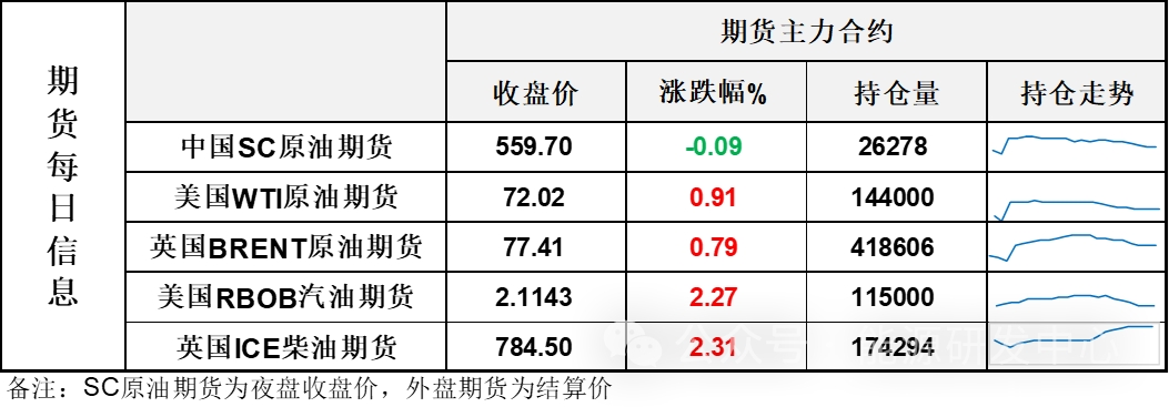 【1】WTI主力原油期貨收漲0.65美元,漲幅0.91%,報72.02美元/桶;布倫特主力原油期貨收漲0.61美元,漲幅0.79%,報77.41美元/桶;INE原油期貨收跌0.09%,報559.7元。