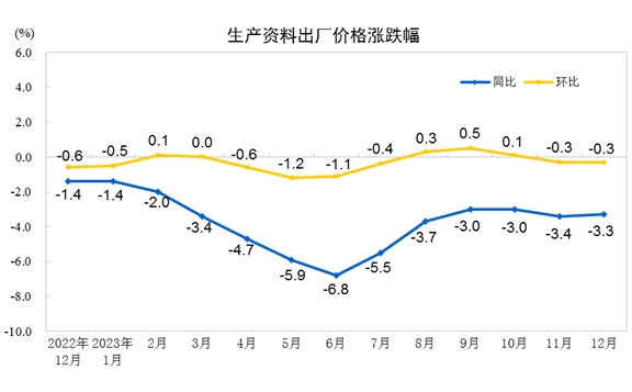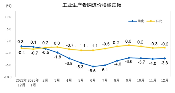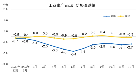 2023年12月份,全國(guó)工業(yè)生產(chǎn)者出廠(chǎng)價(jià)格同比下降2.7%,環(huán)比下降0.3%;工業(yè)生產(chǎn)者購(gòu)進(jìn)價(jià)格同比下降3.8%,環(huán)比下降0.2%。2023年全年,工業(yè)生產(chǎn)者出廠(chǎng)價(jià)格比上年下降3.0%,工業(yè)生產(chǎn)者購(gòu)進(jìn)價(jià)格下降3.6%。