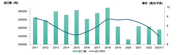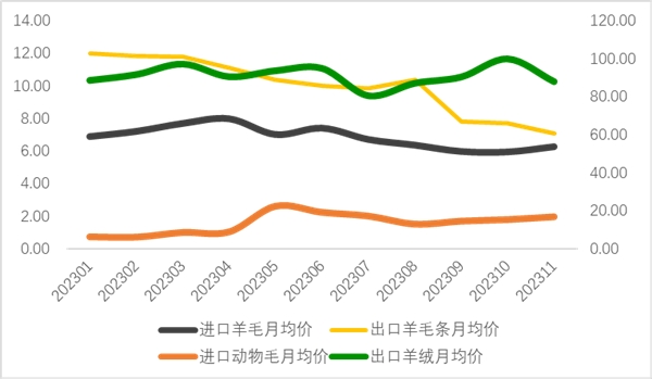 2023年1~11月主要毛紡原料月進口及出口單價情況