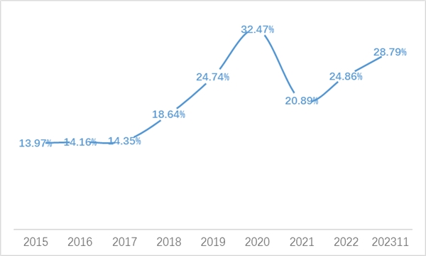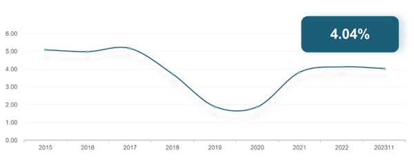 2015-2023規(guī)模以上毛紡織及染整精加工行業(yè)平均利潤率變化情況