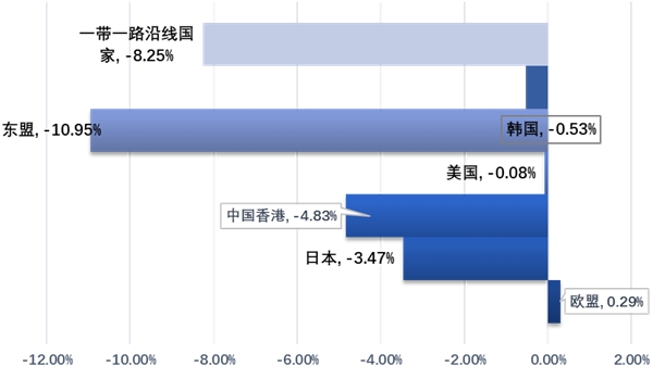 2023年1~11月毛紡原料與制品主要出口目的地出口金額同比變化情況
