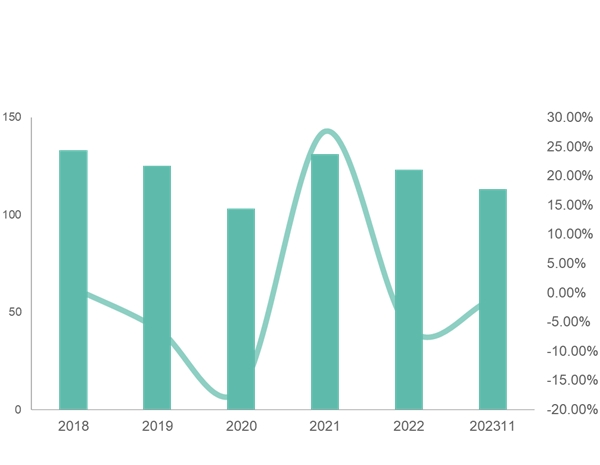 2018~2023年毛紡原料與制品出口金額與同比變化情況