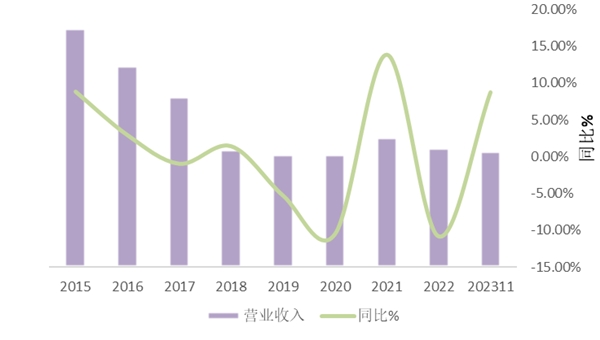 2015-2023規(guī)模以上毛紡織及染整精加工行業(yè)營業(yè)收入變化情況