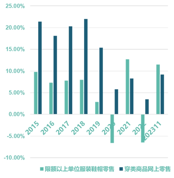 2015-2023年限額以上商品服裝鞋帽零售增速與穿類商品網(wǎng)上零售增速變化情況