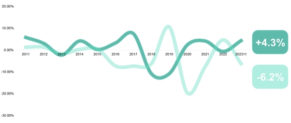 2011-2023年毛紗線與毛織物產(chǎn)量同比變化情況(%)