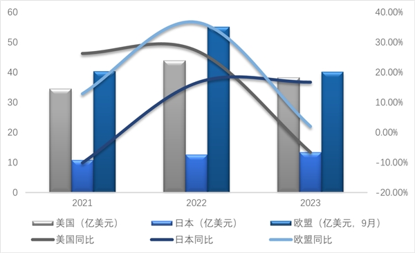 注:2023年美國、日本數(shù)據(jù)截至11月,歐盟數(shù)據(jù)截至9月