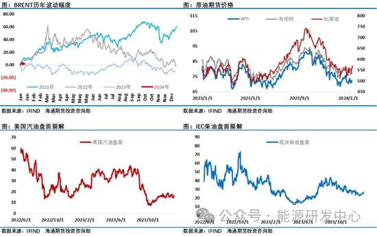但沖高之后油價(jià)并未守住漲幅,這意味著現(xiàn)階段投資者對(duì)油價(jià)后市預(yù)期并未形成一致觀點(diǎn),多空雙方各執(zhí)一端,這直接導(dǎo)致了油價(jià)在新年之后上演了連續(xù)拉鋸戰(zhàn)。一方面對(duì)于歐佩克+一季度減產(chǎn)行動(dòng)效果仍需時(shí)間驗(yàn)證,歐佩克+核心減產(chǎn)國均發(fā)表了積極言論試圖提振市場(chǎng)信心, EIA短期能源展望中判斷歐佩克+減產(chǎn)將導(dǎo)致2024年第一季度全球石油庫存平均減少80萬桶/日,雖然從理性角度判斷從歐佩克+各核心減產(chǎn)國的表態(tài)看會(huì)遵守自愿減產(chǎn)以護(hù)盤油價(jià),投資者對(duì)此有預(yù)期,但押注時(shí)表現(xiàn)謹(jǐn)慎,信心并不足;而近期地緣因素有升溫跡象給油價(jià)注入了溢價(jià),也在一定程度上改善了市場(chǎng)情緒,但總體來看當(dāng)前原油市場(chǎng)局勢(shì)仍然讓投資者保持了克制,對(duì)于追漲操作仍然謹(jǐn)慎,布倫特沖上80美元之后,缺乏追漲意愿讓油價(jià)難以守住漲幅,油價(jià)最終還是退回到多空相持狀態(tài)。