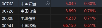 電訊服務(wù)板塊逆勢上漲,中國聯(lián)通、中國電信漲近1%。摩通指,去年中國電信商表現(xiàn)一直跑贏同期恒指40%以上,認(rèn)為投資者今年將繼續(xù)看好電信股,因為在動蕩的市況中更具防守性,而且股息回報吸引,重申中國移動(66.15, 0.00, 0.00%)為行業(yè)首選,維持“增持”評級,目標(biāo)價74.5港元。