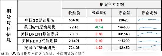 【1】WTI主力原油期貨收跌0.1美元,跌幅0.14%,報72.4美元/桶;布倫特主力原油期貨收漲0.14美元,漲幅0.18%,報78.29美元/桶;INE原油期貨收漲0.31%,報554.1元。