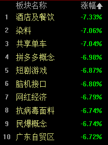 盤面上,各板塊普跌,酒店、短劇游戲、傳媒、拼多多概念等板塊跌幅居前。