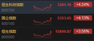 1月24日消息,臨近尾盤市場迎來超重磅消息,央行宣布將于2月5日下調(diào)存款準備金率0.5個百分點,向市場提供長期流動性約1萬億元,港股三大指數(shù)尾盤再度走高,截至收盤,恒生指數(shù)(15899.87, 0.00, 0.00%)漲3.56%,報15899.87點,恒生科技指數(shù)(3281.16, 0.00, 0.00%)漲4.24%,國企指數(shù)漲4.13%。盤面上,科網(wǎng)股集體大漲,阿里巴巴漲超7%,百度、網(wǎng)易、美團漲超6%,京東漲超4%,騰訊漲3.6%;中字頭股午后集體走強,中國鋁業(yè)(3.51, 0.00, 0.00%)漲超8%,中煤能源(7.69, 0.00, 0.00%)漲超7%;重型機械股全天強勢,中國重汽(17.52, 0.00, 0.00%)績后漲超21%;基建、煤炭、教育、石油等板塊漲幅靠前。