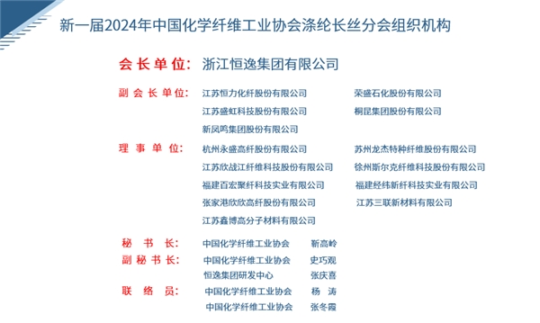 根據(jù)各成員企業(yè)對征詢函的反饋意見及現(xiàn)場參加會議會員單位代表舉手表決,將中國化學(xué)纖維工業(yè)協(xié)會滌綸長絲專業(yè)委員會”改制為“中國化學(xué)纖維工業(yè)協(xié)會滌綸長絲分會”,分會會長實(shí)行輪值制,同時選舉出了新一屆中國化學(xué)纖維工業(yè)協(xié)會滌綸長絲分會組織機(jī)構(gòu),其中,浙江恒逸集團(tuán)有限公司當(dāng)選為新一屆會長單位,江蘇恒力化纖股份有限公司、榮盛石化股份有限公司、江蘇盛虹科技股份有限公司、桐昆集團(tuán)股份有限公司、新鳳鳴集團(tuán)股份有限公司擔(dān)任副會長單位,杭州永盛高纖股份有限公司、蘇州龍杰特種纖維股份有限公司、江蘇三聯(lián)新材料有限公司等擔(dān)任理事單位,中國化學(xué)纖維工業(yè)協(xié)會靳高嶺當(dāng)選為秘書長,中國化學(xué)纖維工業(yè)協(xié)會華東辦事處副主任史巧觀、恒逸集團(tuán)張慶喜當(dāng)選為副秘書長。