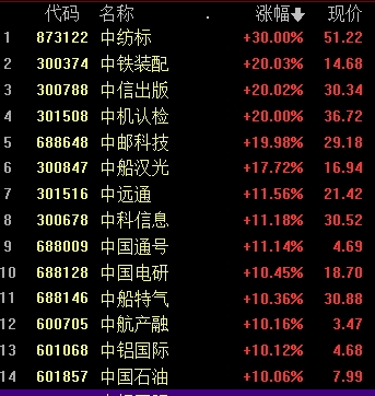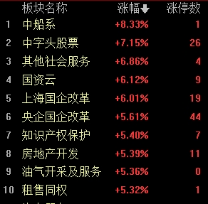 盤面上,各板塊普漲,中字頭股票、上海國(guó)企改革、國(guó)資云、房地產(chǎn)開發(fā)板塊漲幅居前。