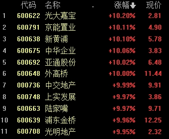 中華企業(yè)、光大嘉寶、京能置業(yè)、新黃浦、中交地產(chǎn)(9.910, 0.90, 9.99%)等多股活躍。