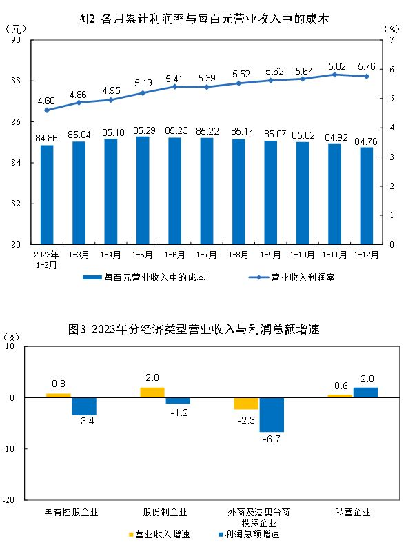 2023年,規(guī)模以上工業(yè)企業(yè)每百元營業(yè)收入中的成本為84.76元,比上年增加0.04元;每百元營業(yè)收入中的費用為8.56元,比上年增加0.20元。