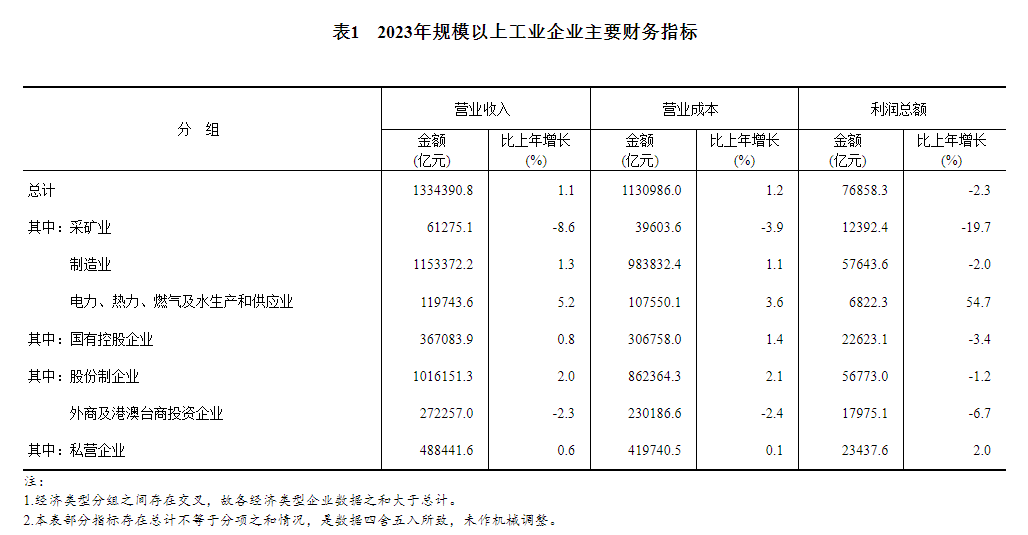 2023年,全國規(guī)模以上工業(yè)企業(yè)實現(xiàn)利潤總額76858.3億元,比上年下降2.3%,降幅比1—11月份收窄2.1個百分點(按可比口徑計算,詳見附注二)。