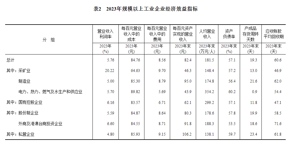 2023年,規(guī)模以上工業(yè)企業(yè)實現(xiàn)營業(yè)收入133.44萬億元,比上年增長1.1%;發(fā)生營業(yè)成本113.10萬億元,增長1.2%;營業(yè)收入利潤率為5.76%,比上年下降0.20個百分點。