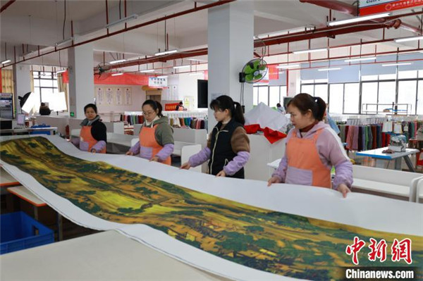 1月25日,工人忙著給十字繡配線