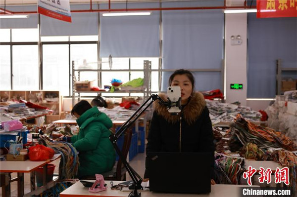 圖為一名主播在十字繡生產(chǎn)線上直播產(chǎn)品